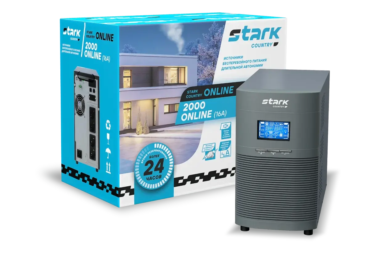 ИБП Stark Country 2000 online, 16А однофазный, переменного тока, изготовлен по технологии двойного преобразования напряжения (онлайн) обеспечивает абсолютную защиту.